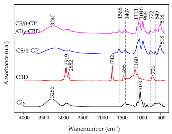FTIR spectrum of glycerol (Gly), CBD, CS/β-GP nanoparticles, and CS/β-GP/Gly-CBD nanoparticles.