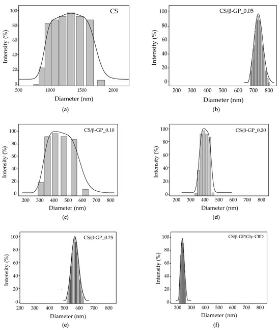 Particle size distribution of nanoparticles from: (a) chitosan; (b) CS/β-GP_0.05; (c) CS/β-GP_0.10; (d) CS/β-GP_0.20; (e) CS/β-GP_0.25; (f) CS/β-GP/Gly-CBD.