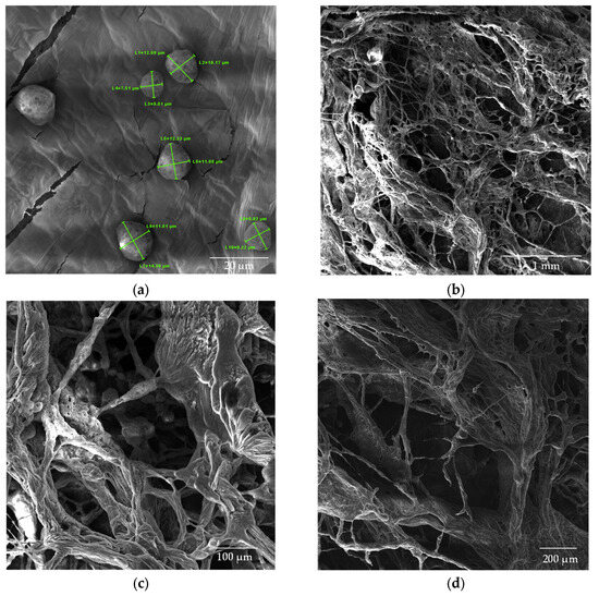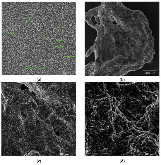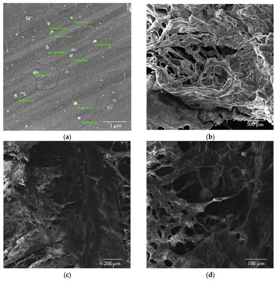 The chitosan (CS) nanoparticles used as a control exhibited a well-defined spherical morphology, as shown in Figure 8a. The analysis of the average particle size revealed dimensions of 10.7 × 103 ± 1.87 × 103 nm for the CS solution in the absence of β-glycerophosphate (β-GP). The lyophilized chitosan samples (Figure 8b–d) exhibited a structure with larger and non-uniform pores, emphasizing the impact of the lyophilization process on nanoparticle morphology.