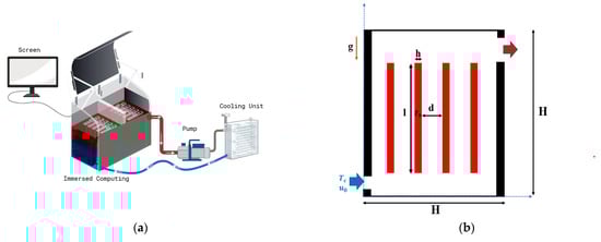 (a) Schematic diagram of a system for cooling by immersion in nanofluid, (b) Schematic representation of the studied geometry and dimensional parameters.