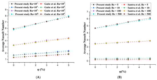 Comparison of heat transfer results: present study vs. established trends, (A): natural convection Guite et al. [39] and (B): forced convection Santra et al. [40].
