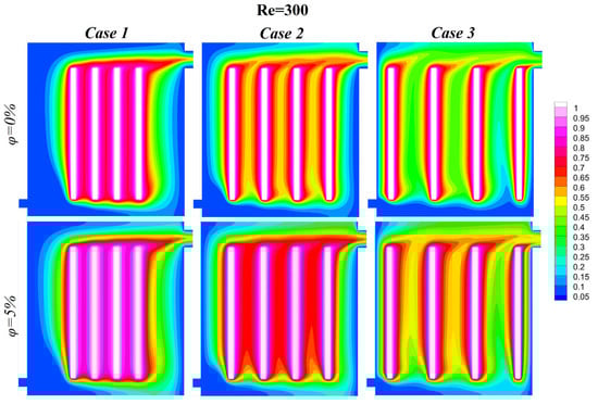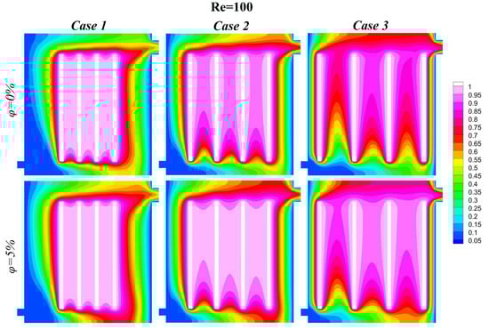 The significance of the Reynolds number and nanoparticle volume fraction in enhancing the convective heat transfer within immersion cooling systems is demonstrated in this study. It is demonstrated that higher Reynolds numbers indicate stronger inertial forces, which promote increased fluid motion and more effective thermal energy transport. The inclusion of nanofluids, i.e., fluids that exhibit superior thermal conductivity due to the inclusion of nanoparticles, amplifies the heat transfer performance even further. The isothermal contours presented in Figure 3, Figure 4, Figure 5, Figure 6 and Figure 7 illustrate the impact of varying Reynolds numbers, nanoparticle volume fractions, and block spacing at a constant Rayleigh number () on the thermal performance of the system. These results demonstrate how these parameters influence the heat transfer efficiency and cooling uniformity. The addition of nanoparticles significantly improves heat dissipation. For the base fluid (), the isothermal contours demonstrate the pronounced temperature gradients around the heated blocks, indicating localized heat retention and reduced thermal management efficiency. In contrast, a nanoparticle volume fraction of 5% increases the fluid’s thermal conductivity, resulting in more uniform and extended thermal plumes. This enhancement has been shown to reduce thermal resistance and improve heat transfer from the heated blocks to the cooling medium, thus highlighting the effectiveness of nanoparticle-enhanced nanofluids.