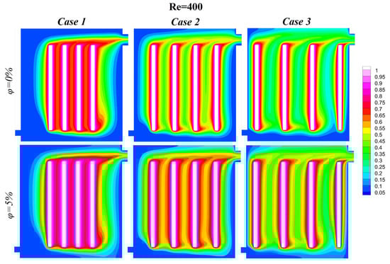 The nanoparticle volume fraction exerts a substantial influence on the Nusselt number. As , increases from 0% to 5%, there is an enhancement in the thermal conductivity of the nanofluid due to the superior heat conduction properties of the nanoparticles. This enhancement in thermal conductivity results in a gradual increase in the Nusselt number with the rising ϕ. The effect of nanoparticle volume fraction is most pronounced at higher Reynolds numbers, where turbulent flow enables a more effective utilization of the nanoparticles’ enhanced thermal conductivity, further amplifying heat transfer efficiency. Block spacing also plays a critical role in determining the heat transfer performance. In Case 3, which features the largest spacing, Nusselt umber values are consistently the highest across all Reynolds numbers and nanoparticle volume fractions. The increased spacing minimizes thermal interference between adjacent blocks, allowing thermal plumes to disperse more effectively and promoting uniform cooling. In contrast, Case 1, with the smallest spacing, exhibits the lowest Nusselt number values due to significant thermal plume interactions and the formation of localized hotspots. Case 2, with moderate spacing, performs better than Case 1 but remains inferior to Case 3, demonstrating a gradual improvement in heat transfer efficiency with increasing block spacing.