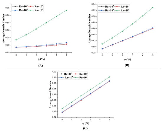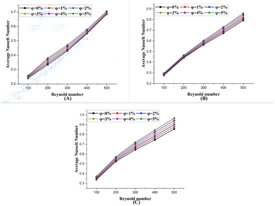 Average Nusselt number variation, with Reynolds number, for different nanofluid volume fractions, at Rayleigh number in each case, (A): case 1, (B): case 2, (C): case 3.