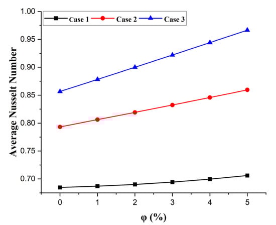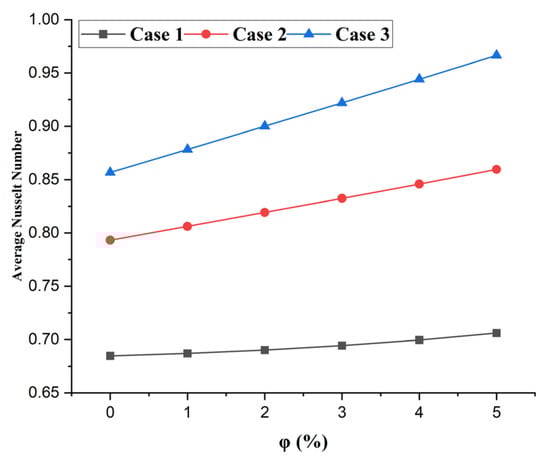 Comparison of the average Nusselt numbers for the three cases, at various volume fractions, in and .