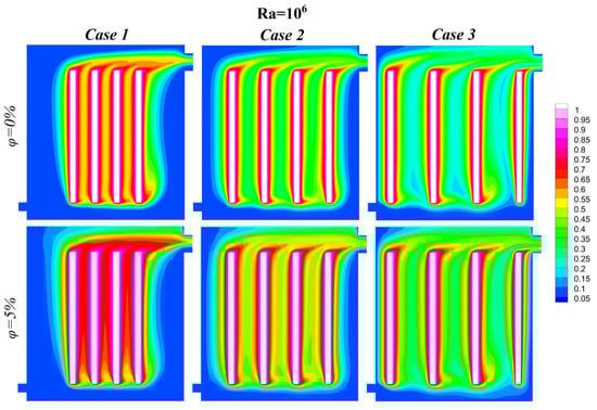 An increase in the Rayleigh number leads to an intensification of the buoyancy-driven flow, thereby strengthening the natural convection mechanism. Conversely, at lower Rayleigh numbers, convective flow is weak, resulting in less diffuse thermal plumes and distinct thermal layers around the heated blocks. In this regime, fluid-block surface interactions are minimal. Conversely, at higher Rayleigh numbers, stronger buoyancy forces generate vigorous convective currents, thereby enhancing fluid mixing and heat transfer. The thermal plumes become more uniform and extensive, indicating improved heat dissipation from the blocks into the surrounding fluid. The addition of nanoparticles () significantly enhances the system’s thermal performance, as the nanofluid’s improved thermal conductivity reduces thermal resistance, leading to a more uniform temperature distribution and smoother isothermal contours. This effect is particularly pronounced at higher Rayleigh number values, where convective forces amplify the impact of nanoparticle-enhanced conductivity. However, at lower Rayleigh number values, the influence of nanoparticles is less significant due to the dominance of conduction over convection in heat transfer.