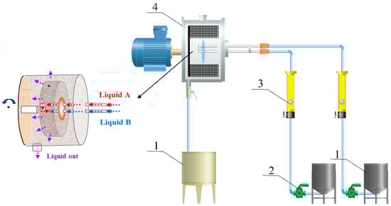 Schematic diagram of the experimental process for preparing alkyl polyglycoside by IS-RPB. 1. Liquid storage tank; 2. peristaltic pump; 3. liquid flowmeter; 4. IS-RPB.