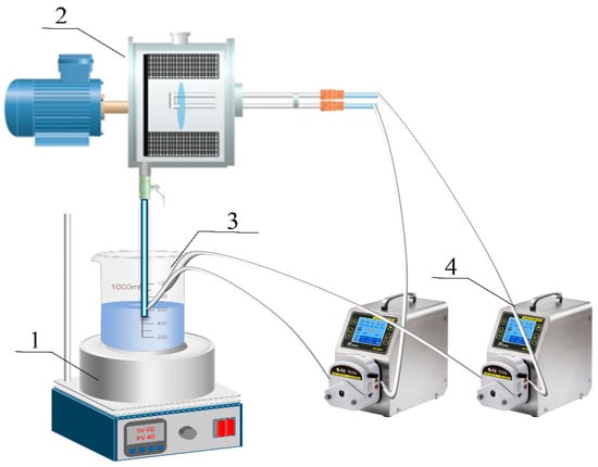 Schematic diagram of the experimental process for preparing alkyl polyglycoside by heating circulation. 1. Oil bath kettle; 2. IS-RPB; 3. collection tank; 4. peristaltic pump.