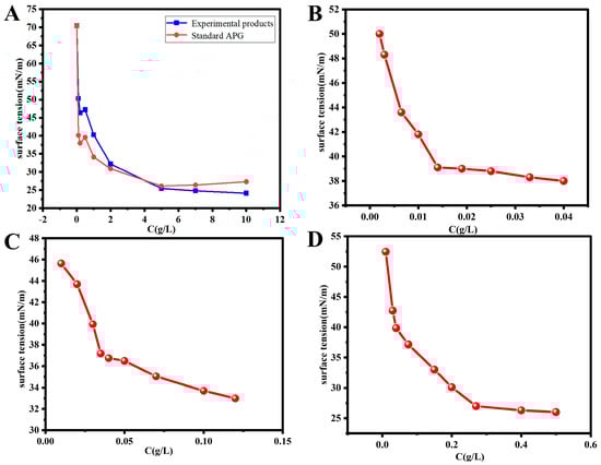 (A) Surface tension of alkyl polyglycoside at different concentrations; (B) surface tension of tween 80 at different concentrations; (C) surface tension of SDBS at different concentrations; (D) surface tension of DTAC at different concentrations.