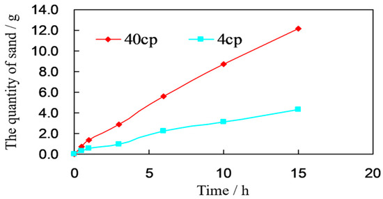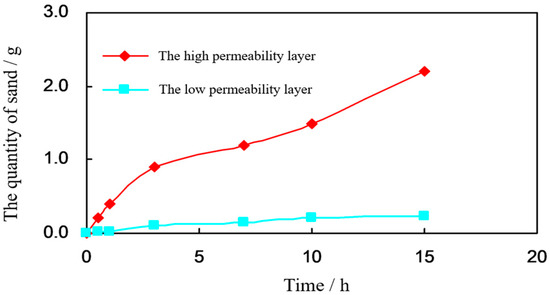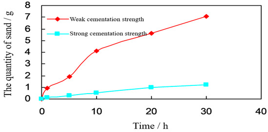 20] and development of large pore channels has been studied, and the relation curve of sand production with time change under different cementation degree has been obtained, as shown in