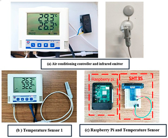 As shown in Figure 5a,b, the system contains two temperature sensors, which are deployed at different locations indoors, and the indoor temperature measurement data are averaged to reflect the comprehensive adjustment effect of the room temperature. The sensors are the RS-WS-ETH-6 temperature and humidity sensor (range: −40 °C to 80 °C, accuracy: ±0.5 °C) and the SHT35 temperature and humidity measurement module (range: −40 °C to 125 °C, accuracy: ±0.2 °C) from Shandong Renke. The SHT35 module is connected to the Raspberry Pi control board through the I2C protocol, and the temperature measurement data are sent to the energy management monitoring platform through Raspberry Pi.