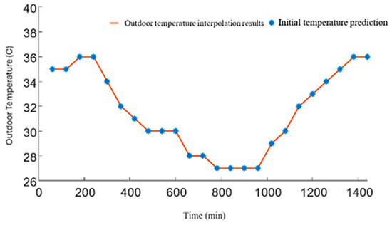 During each control cycle, the energy management monitoring platform sends a data request to the API, which responds with detailed meteorological data for the next 24 h. To align with the control system’s sampling intervals, the 24 h temperature data are interpolated. The resulting temperature prediction is illustrated in Figure 6.