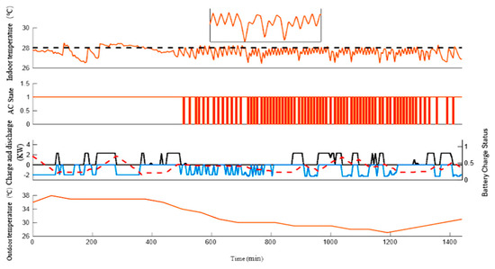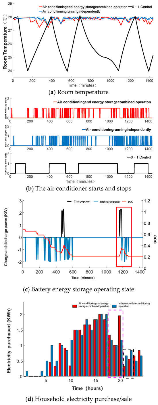 In Experiment 1, the effectiveness of the suggested control measures was contrasted and examined under the same circumstances. The simulation, which focused on assessing the benefits of the air conditioning–battery energy storage system operating together as opposed to the air conditioning system operating independently, was powered by historical outdoor temperature data from a particular day. Figure 8 shows the outcomes of the simulation.