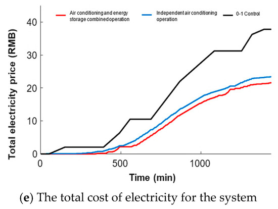 Additionally, the financial advantages of using the energy storage system and air conditioner together were examined. Under MPC management, the energy storage system and air conditioning have lower daily electricity costs, as seen in Figure 8. The energy management system’s capacity to maximize battery storage utilization is responsible for this. As indicated by the red box in Figure 8c, using the battery’s stored energy is prioritized during times when electricity prices are at their highest.