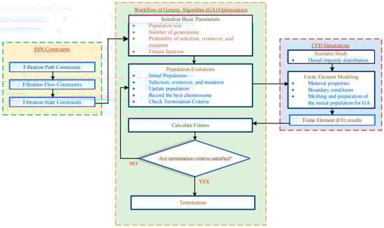 The GA in this study incorporates selection, crossover, mutation, generation gap, and elitism strategies to optimize the design and configuration of the emergency diesel filtration system [,,].