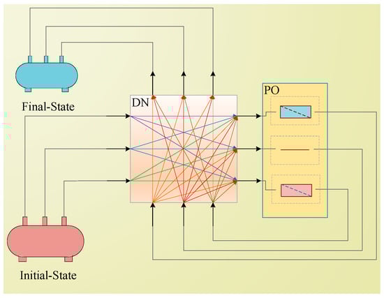 The optimal individual obtained is [0.007, 0.007, −0.014, 1, 1, −1, 1, 1, −1], with an optimal objective value of 417,600. Based on this optimal solution, the following conclusions can be drawn: For inlet 1 and inlet 2, the filtration status for both water impurities and mechanical impurities is 1, indicating that the diesel at these inlets undergoes filtration and is returned. For inlet 3, the filtration status for both water impurities and mechanical impurities is −1, indicating that it serves as an outlet and does not undergo filtration. Consequently, the optimal filtration structure can be derived, forming an SSN, as shown in Figure 9.