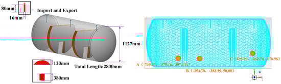 As shown in Figure 3, this study adopts a scaled physical model of an emergency diesel storage tank from a nuclear power plant, using the actual tank as a prototype. The internal complex components are omitted, and the main structure of the tank is retained. A 1:125 scaled physical model is created using SolidWorks 2021 3D modeling software. The model is centered at the midpoint of the length, width, and height, with three detection points designated as A, B, and C.
