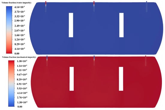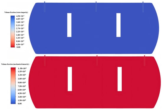 We obtained a degraded diesel sample with water and mechanical impurity volume fractions of 0.00045 and 0.000015, respectively. The threshold volume fractions for water and mechanical impurities at the three monitoring points are set to 0.00035 and 0.000010, respectively. This means that when the volume fractions of water and mechanical impurities at all three monitoring points are below 0.00035 and 0.000010, the diesel in the tank is considered to meet the required quality standards. The initial impurity distribution in the diesel tank is shown in Figure 6 below. To ensure proper analysis, the specific diesel tank configuration and impurity levels used in this study are based on past engineering projects and represent the preliminary internal requirements of the industry. These parameters reflect typical operational conditions, ensuring the relevance and practicality of the proposed framework.