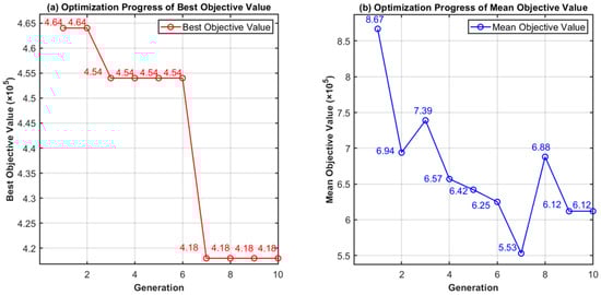 As shown in Figure 7, the optimal objective value plot illustrates the optimization process across generations. In the initial optimization phase (from generation 1 to generation 3), the initial optimal objective value was 4.64 × 10⁵, indicating that the population contained some quality solutions at the start. During this stage, the objective value remained stable, suggesting that the algorithm was conducting a broad global search without significantly improving the optimal solution.