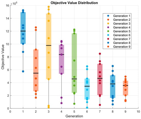 In Figure 8, the boxplot presents the distribution of objective values across different generations, highlighting the overall quality change trends and the dispersion characteristics of the population’s solutions during the optimization process.