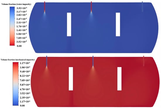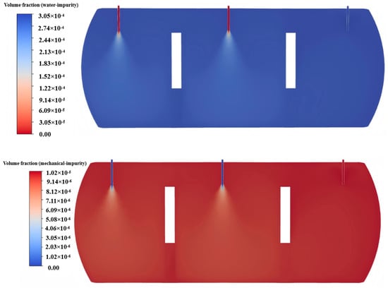 Filtration state at 72 h (top: volume fraction of water impurities; bottom: volume fraction of mechanical impurities).