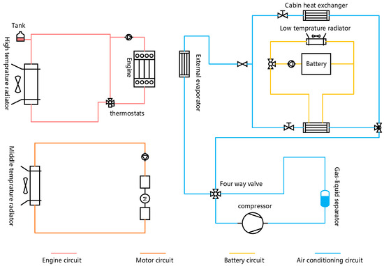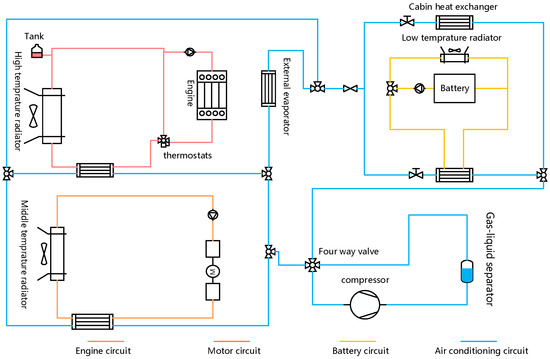 This study selects a P2-configuration hybrid electric vehicle (HEV) [17] as the research subject. The original vehicle thermal management system (TMS) consists of four circuits, as shown in Figure 1. The battery circuit alternates between different loops, utilizing a temperature-feedback-based electromagnetic three-way valve, to maintain the battery’s optimal operating temperature. At low temperatures, the battery dissipates heat through the air-cooling circuit, while the heat exchanger in the air conditioning circuit heats the battery. The cabin temperature is controlled by the air conditioning system. Due to its simple structure, the independent thermal management system offers flexible temperature control for components within subsystems and lower manufacturing and maintenance costs, leading to its widespread adoption. However, the independent thermal management system, by keeping all subsystems entirely separate, restricts energy flow within the thermal management system. This is especially problematic in low-temperature environments, where the waste heat generated by the motor and engine cannot be efficiently utilized, resulting in energy waste.