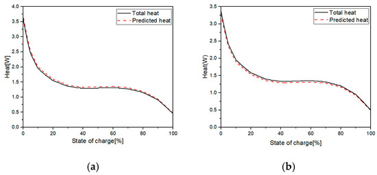 The battery heat generation model was validated by evaluating the heat generation during 1C charging and discharging, where 1C refers to the rate at which the battery is charged or discharged in one hour, corresponding to a current that will fully charge or discharge the battery in one hour, following the method of Liu et al. [22], as presented in Figure 5. The errors between the predicted and measured results were within 10%. The battery parameters are listed in Table 3.
