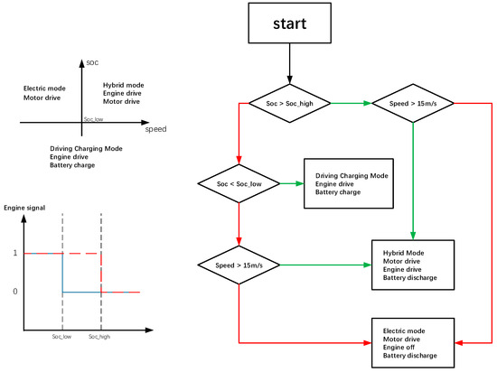 The vehicle adopts a rule-based energy management strategy, as shown in Figure 6. Under conditions where the state of charge (SOC) is above the set threshold soc_high and the vehicle speed is below 15 m/s, the vehicle operates in pure electric mode. If the vehicle speed exceeds 15 m/s, the vehicle switches to hybrid drive mode. Under conditions where the SOC drops below the set threshold Soc_low, the vehicle enters the charging while driving mode, where the engine drives the vehicle and powers the generator to charge the battery until the SOC rises above the set threshold soc_high. To prevent frequent start–stop cycles of the engine, the vehicle maintains the previous driving mode when the battery SOC is between soc_high and soc_low.
