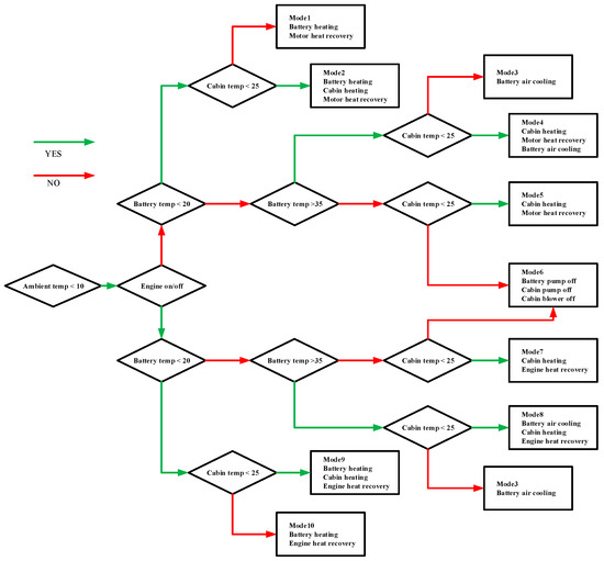 The mode switching rules for the thermal management system (TMS) are established based on the energy management strategy. The selection of the mode is determined by engine signals, battery temperature signals, and cabin temperature signals. The logic diagram for mode switching is shown in Figure 7.