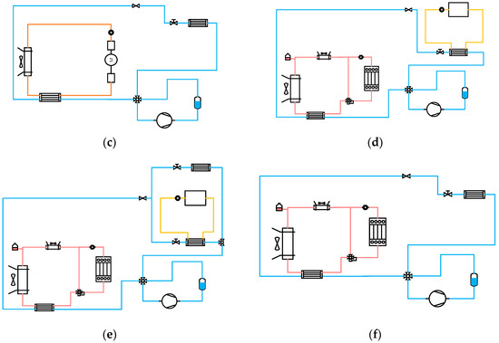 Heating circuits of integrated thermal management system: (a) Circuit 1 battery heating (engine off), (b) Circuit 2 battery and cabin heating (engine off), (c) Circuit 3 cabin heating (engine off), (d) Circuit 4 battery heating (engine on), (e) Circuit 5 battery and cabin heating (engine on), (f) Circuit 6 cabin heating (engine on).