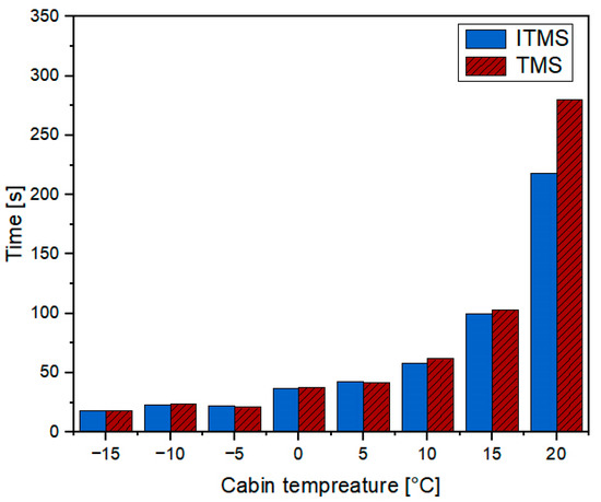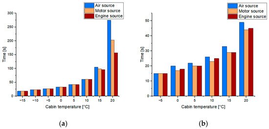 Time to reach the target cabin temperature at different ambient temperatures: (a) −20 °C, (b) −10 °C.