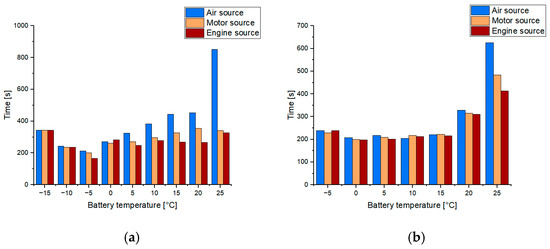 Time to reach the target battery temperature at different ambient temperatures: (a) −20 °C, (b) −10 °C.