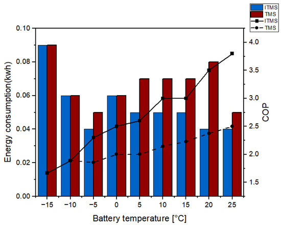 Regarding system energy consumption, Figure 16 shows the energy required to raise the battery temperature by 5 °C increments, and the corresponding Coefficient of Performance (COP) is an efficiency indicator of a heat pump or refrigeration system. Its calculation method is shown in (17).