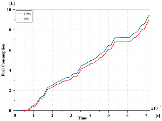 As the battery temperature increases, the energy consumption of the integrated TMS is significantly lower than that of the independent TMS, and the COP is higher. Considering the impact of battery temperature and heat pump power on overall vehicle energy consumption, Figure 17 presents the vehicle fuel consumption curve. With the integrated TMS, fuel consumption is 8.978 L, whereas with the independent TMS, it is 9.468 L.