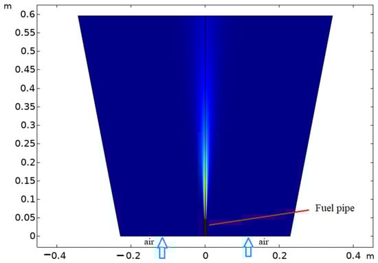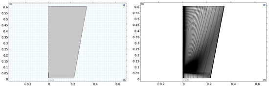 In this case, the jet’s turbulent flow efficiently blends the fuel exiting the pipe with the surrounding oxygen. Furthermore, continuous combustion of the mixture is required. The Reynolds number for the jet, which is influenced by the inlet velocity and the pipe’s inner diameter, is approximately 16,700, confirming a fully turbulent state [32]. The initial conditions and assumptions for the analysis were derived from previous research [4]. Under these conditions, turbulence plays a crucial role in both the mixing and reaction processes within the jet. To incorporate turbulence effects, the k-ω turbulence model was employed in solving the flow field [4,32]. Utilizing symmetry, a two-dimensional model was formulated and solved using a cylindrical coordinate system (Figure 2). Before the analysis studies were carried out, mesh independence studies were carried out. The mesh number was chosen as 12,800 with 1% precision. Highly nonlinear equations are addressed through a series of solution steps. This approach is vital to ensuring a reliable solution process when tackling highly coupled models. The resolution of highly nonlinear equations is achieved through multiple solution steps. This approach is essential for ensuring a reliable solution process when addressing models characterized by significant coupling. The numerical simulation of the turbulent reaction flow within the burner and combustion chamber was conducted utilizing the COMSOL software 5.3. This platform enables the application of the finite volume method alongside various physical models, including laminar, viscous, turbulent, and others, to address the governing equations pertaining to fluid dynamics and species transport. A relative tolerance of 0.001 was implemented. The PARADISO solver 5.3 was employed for fluid flow, turbulence parameters, mass fractions, and temperature, while the SIMPLE algorithm was utilized for the remaining variables. The mesh configuration employed for resolving syngas combustion issues is constructed using the free triangle pattern. The maximum element size is established at 0.039, while the maximum growth factor is set to 1.3. Additionally, the resolution for narrow regions is defined as 1.