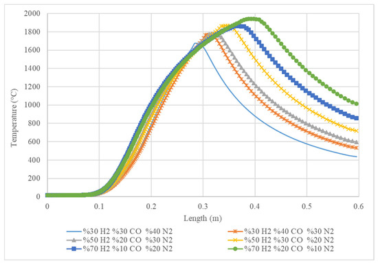 The peak temperature increases significantly, indicating that hydrogen has a more substantial impact on raising the temperature. In the mixture of 50% H2, 30% CO, and 20% N2, with equal amounts of H2 and CO and a reduced N2 content, the temperature distribution shows a high peak temperature. The results suggest that reducing N2 and increasing H2 and CO leads to higher temperatures. This mixture (70% H2, 10% CO, 20% N2) is dominated by hydrogen, with a very low CO content and moderate N2. The highest maximum temperature is observed in this scenario, highlighting the significant role of hydrogen in raising the temperature. The mixture of 70% H2, 20% CO, and 10% N2 is similar to Figure 4e but with a higher CO content and lower N2. The temperature distribution is slightly more uniform, but the peak temperature remains high, confirming the influence of hydrogen.