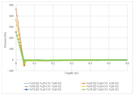 Figure 7 displays the pressure of four different gas mixtures as they flow along a specified length. The x-axis represents the length in metres, and the y-axis represents the pressure in Pascals (Pa). Each line represents a different gas mixture, with the percentages of hydrogen (H2), carbon monoxide (CO), and nitrogen (N2) indicated in the legend. The graph shows that the pressure drops significantly along the length of all mixtures, indicating that the gases are expanding as they flow. The initial pressure is highest for the mixture with 30% H2, 40% CO, and 30% N2 (orange line) and decreases the fastest. The pressure drop is less significant for the mixture with 70% H2, 20% CO, and 10% N2 (green line), indicating a slower expansion rate. The graph suggests that the gas composition affects the pressure drop rate, with mixtures containing higher percentages of hydrogen exhibiting a faster pressure drop.