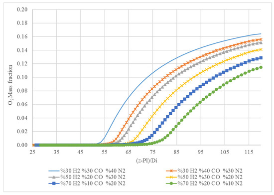 Figure 10 shows a graph of the O2 mass fraction along the axial position normalized by the inlet diameter (z−PI)/Di for different gas mixtures. The legend indicates the composition of each gas mixture, and the graph displays how the oxygen (O2) mass fraction evolves along the reactor’s length for these mixtures.