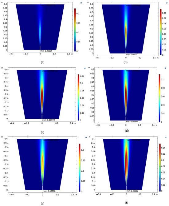 The colour bar (Figure 13) next to each subplot represents the concentration of H2O. The scale ranges from 0 (blue) to the maximum concentration (red) shown in the colour bar. The plots illustrate the vertical spatial distribution of H2O concentration in the simulation domain. The x-axis represents the horizontal distance (m), and the y-axis represents the vertical distance (m). Areas with red or warmer colours indicate higher concentrations of H2O. Areas with blue or cooler colours indicate lower concentrations of H2O. Figure 13a shows a balanced mixture of H2 and CO, with a higher concentration of N2, leading to a specific H2O distribution. Figure 13b increases the CO percentage while decreasing N2, which alters the H2O concentration pattern. Figure 13c,d have higher H2 percentages, impacting the combustion process and H2O formation. Figure 13e,f have the highest H2 concentrations, significantly affecting the H2O distribution due to the reduced CO and N2 components.