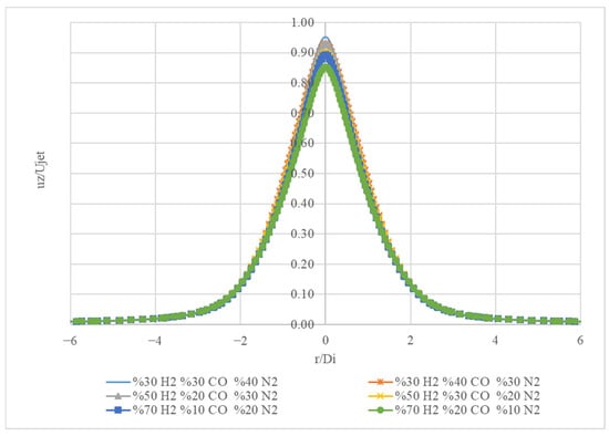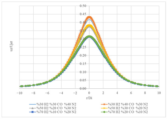 Figure 14 presents the normalized axial velocity (uz/Ujet) profiles for different gas mixtures as a function of the radial position (r/Di).