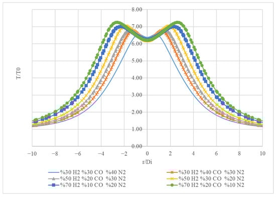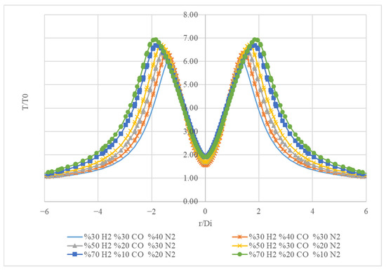 Figure 16 presents temperature profiles (T/T0) as a function of the radial distance (r/Di) for three different gas compositions. On the x-axis (r/Di), the radial distance is plotted from −6 to 6, indicating the distance from the centre of the system. On the y-axis (T/T0), the temperature is normalized to a reference temperature (T0), ranging from 0 to 8.