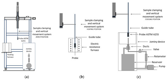 - The design and construction of the heating furnace allowed us to reach the processing temperatures in the steel alloy samples. In the tests carried out, it was necessary to get different temperature indices to obtain an austenitic phase, surpassing the AC3 equilibrium line of the Fe-Fe3C phase diagram, which was successfully surpassed by the thermal power defined as a design parameter. In addition, the furnace capacity was adequately adjusted to the process requirements of each type of sample. Both in the heating process and in the cooling of the samples, thermal histories were recorded through the sensors embedded in the furnace structure and in the test piece without manipulation of the sensors by an operator. The furnace operates with a single-phase connection at 110–127 V and was controlled in On-Off mode for the initial tests processed in this work. The control device was activated by a command signal linked to the displacement system order and with feedback to a safety stop system using an alarm. In future work, control systems will be designed to implement heating ramps associated with PID processes or their variants.