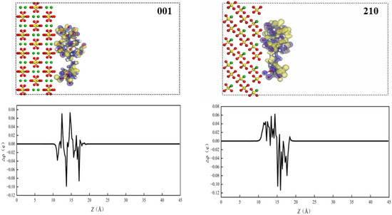 To further verify the performance characteristics of the polymers, computational adsorption simulations were conducted for the (210) and (001) crystal faces of barium sulfate (in Figure 1). The variation in electron density is represented by positive values (indicating electron accumulation) and negative values (indicating electron depletion), denoted in blue and yellow, respectively. On the (210) and (001) planes, a net electron transfer occurs from the polymer molecules to the barium sulfate substrate, primarily concentrated within the barium sulfate layer. This electron transfer is predominantly driven by the carboxylic acid (-COOH) functional group on the polymer. On the (001) plane of barium sulfate, the carboxylic acid group of the scale inhibitor molecule donates an average of 0.07 e− electrons to the barium sulfate surface. Simultaneously, electrons from other functional groups (including carboxylic acids, sulfonic acids, and amino acids) compensate for the electron loss from the carboxylic acid group, thus maintaining the overall charge neutrality of the system. On the (210) plane of barium sulfate, the carboxylic acid group of the scale inhibitor molecule transfers an average of 0.06 e− electrons to the barium sulfate surface. This observation suggests that the adsorption properties of barium sulfate vary across different crystalline planes, attributed to the distinct interactions between the polymer functional groups and the crystalline planes.