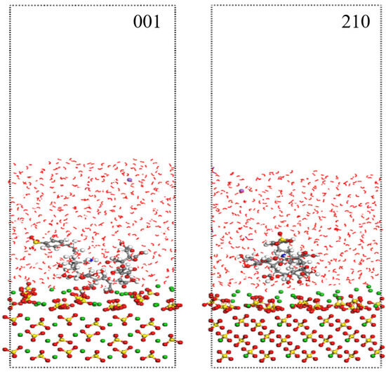 The adsorption energy of barium sulfate on various crystalline surfaces increases with rising temperature, a phenomenon attributable to the influence of temperature on molecular motion and interaction energy. Specifically, the rise in temperature increases the thermal motion of molecules, thereby enhancing intermolecular forces—such as van der Waals and electrostatic interactions—between barium sulfate and the scale inhibitor, leading to an increase in adsorption energy. Notably, the adsorption energy reached a maximum value of −39.677 kcal/mol on the (001) crystal surface when the temperature was 75 °C. This result suggests that the interaction between the scale inhibitor and barium sulfate is strongest at this temperature. In contrast, on the (210) crystal surface, the adsorption energy at 75 °C was −27.08 kcal/mol, relatively low compared to the (001) surface. Furthermore, it is noteworthy that the adsorption energy on the (210) crystalline surface at 50 °C is higher than that on the (001) crystalline surface, highlighting a significant difference in the effect of the scale inhibitor on various crystalline surfaces of barium sulfate at different temperatures.