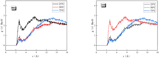 In statistical mechanics, the RDF characterizes the distribution of particles within a system. It is defined as the ratio of the particle density at a distance r from a reference particle to the average particle density of the system. This function can be utilized to describe the interaction between oxygen (O) atoms in a polymer and barium (Ba) ions on the surface of barium sulfate crystals, allowing for the observation of particle aggregation at specific distances and the inference of the interaction forces between them. As shown in Figure 3, all the peaks appear at a distance of approximately 3.5 Å. The peaks at this distance are primarily composed of Coulomb and van der Waals forces [41]. This also suggests a strong van der Waals interaction between the oxygen atoms in the polymer and the barium ions on the surface of barium sulfate, which influences the adsorption energy and corroborates the findings presented in Table 6.