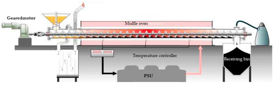 The processes of carbonization and activation of the feedstock ensure the formation of the necessary structural and physicochemical properties in the final products. The synthesis was carried out by carbonization and activation of plant materials in a specially made furnace at temperatures from 300 to 1000 °C for 30–90 min without air access in a carbon dioxide atmosphere. Figure 1 demonstrate a pilot plant for obtaining carbonizates from plant raw materials (5 kg per hour).