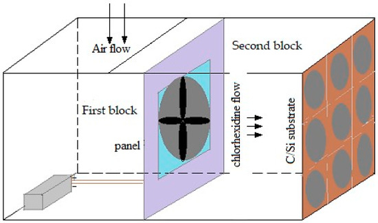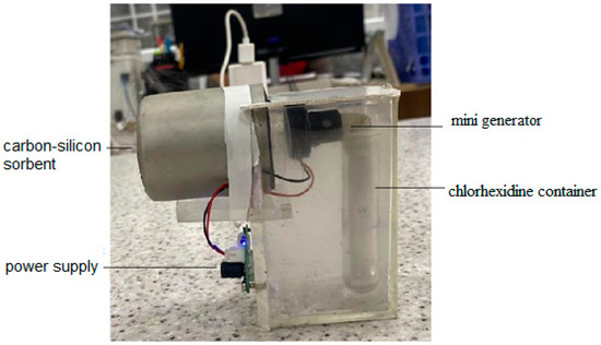 As shown in Figure 4, the design of the carbon-silicon sorbent includes a system with a low-frequency mini-generator. Here, the ultrasonic mini-generator is used as a source of antibacterial agent spraying, and the solution is sprayed through the carbon-silicon sorbent onto the environment. The generation time of antibacterial agent spraying depends on the amount of solution contained in the container. In particular, the productivity of the work shift was from 4 to 10 h.