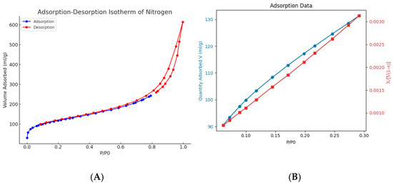 (A) Nitrogen adsorption–desorption isotherm (B) Adsorption data and BET linear plot.