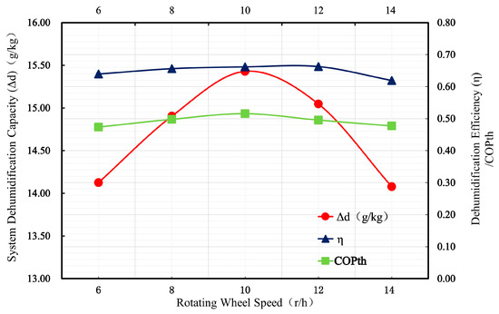 Therefore, there must be an optimum rotating wheel speed at which the residence time becomes equal in both zones to maximize the dehumidification capacity and energy utilization efficiency. The experimental data showed that the dehumidification capacity, efficiency, and COPth reached their maximum values at a speed of 10 r/h.
