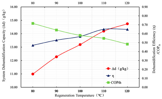 In this study, the regeneration air was heated using ship waste heat. A lower COPth indicates a higher utilization rate of waste heat. However, considering the limitations of the heating equipment and the requirements of the desiccant regeneration performance, the regeneration temperature must be controlled within a reasonable range. An optimal regeneration temperature exists where desiccant regeneration efficiency and energy consumption are balanced. At this temperature, the moisture is fully desorbed in order to regenerate the maximum absorption capacity of the desiccant. The energy consumption for regeneration air is reasonable, and the system attains optimum values for Δd, η, and COPth. The experimental results indicated that the optimum performance of the system was achieved at a regeneration temperature of 110 °C, which is in conformity with the above analysis.